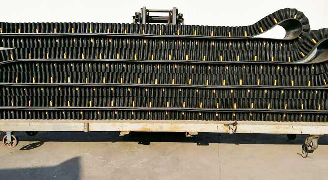 更換輸送帶,可將新帶與舊帶連在一起,卸帶與安裝新輸送帶同時(shí)進(jìn)行對(duì)于水平運(yùn)轉(zhuǎn)的輸送機(jī),可在任何一點(diǎn)切斷舊輸送機(jī),傾斜方向運(yùn)轉(zhuǎn)的輸送機(jī),則需選好切斷點(diǎn),防止因自重引起下滑失控。在輸送機(jī)上將新帶的位置放正后,用夾具將膠帶的一端固定好,然后與繞過輥與帶輪的繩索相連,通過牽引裝置將輸送帶平衡的架到輸送機(jī)上,牽引時(shí),要防止輸送帶與機(jī)架相互擠壓。