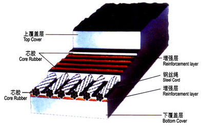 抗撕裂(橫向增強)型鋼絲繩芯輸送帶 結構體 新型結構鋼絲繩用作拉伸體,縱向鋼絲繩的一側或兩側垂直排列,鋼絲繩,鋼絲繩,纖維繩,纖維布等增強層均勻分布在側面。